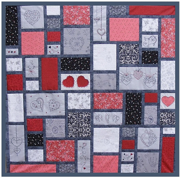 This quilt will add a romantic feel to your decor. It features simple patchwork techniques and basic embroidery stitches. Coordinating Love Trio Cushion also available.